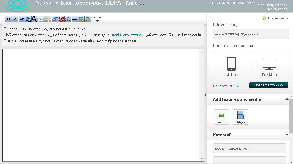 - Після створення сторінки потрібно дати назву блогу. Бажано, щоб воно не було довгим, але повним. Потім у відкритому вікні необхідно перейти до заповненню поля. При заповненні діють аналогічні правила вікі-розмітці, але і у звичайному редакторі, додання зображень відбувається так само, як і звичайно.