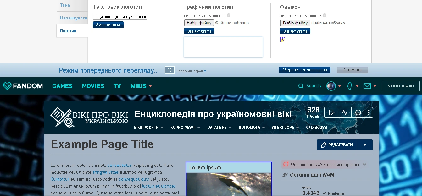 На вікі немає галереї стандартних логотипів (як, наприклад, у фона), тому необхідно завантажити його на вікі самостійно. Графічний логотип може бути тільки формату .PNG і може мати будь-які розміри, але не більше 250px в ширину і 65px в висоту. Завантажений логотип зберігається як Файл:Wiki-wordmark.png.
