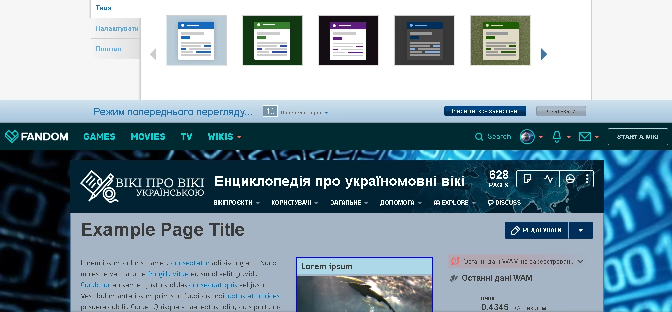 Слід пам’ятати про те, що дозвіл картинки повинен бути близько до 1980х1024рх. Якщо необхідно строго зафіксувати фонову картинку, потрібно поставити галочку в графі «фікс». У цьому випадку, картинка не буде «їхати» вгору при прокрутці вниз довгих сторінок вікі. Для найгарнішого відображення, фонове зображення зазвичай розділюється і відображається праворуч та ліворуч від вмісту сторінок. У центрі при цьому з’являється смуга, колір якої зазначається в графі «в центрі». Щоб зображення не розділялося, необхідно завантажити зображення, ширина якого перевищує 2000px, тоді з’явиться пункт, в якому потрібно буде поставити галочку «не розділяти».