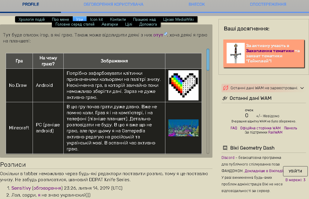 Далі користувач за бажанням може відредагувати цю сторінку, написавши там усе, що буде вважати необхідним. Перехід на профайл відбувається або за посиланням на користувача в історії редагувань, стінах обговорень, форумі, обговореннях або підписі, або за натисканням на мініатюру аватара в глобальному навігаційному меню.