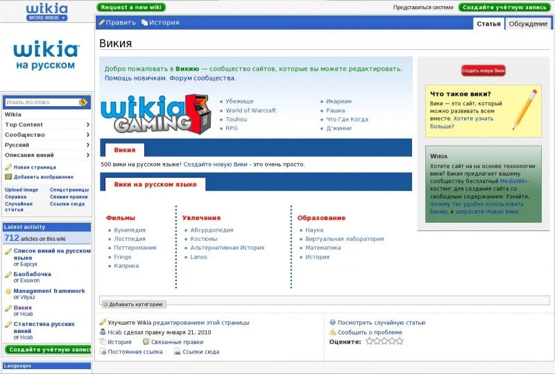 Ліворуч знаходилися меню вікі, пошук та вікі-активність. Вгорі знаходилися блок Wikia, а трохи нижче кнопки «Редагувати» та «Історія». Внизу і праворуч знаходилася основна частина вікі, тобто сама сторінка.