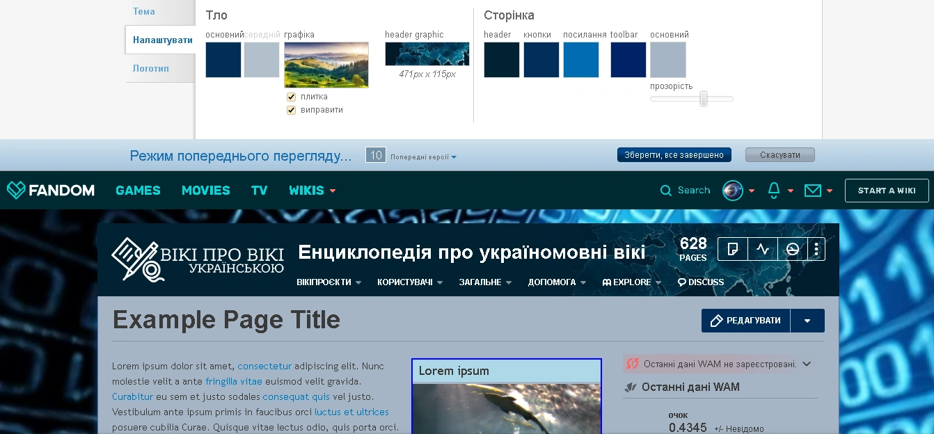 Однією з сильних сторін Wikia є її можливість налаштування, яка досягається завдяки унікальному інструменту «Конструктор тем», який дозволяє швидко змінювати: