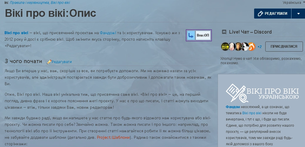 Як правило, в цьому просторі розташовуються різні локальні правила вікі, керівництва по роботі з редагуванням, поради, сторінки спільноти та інше. Сторінки Project виглядають як звичайні статті проєкту і мають практично ті ж властивості. Зазвичай такі сторінки правлять і створюють тільки адміністратори проєкту, проте редагування цих сторінок звичайними користувачами і анонімами технічно не заборонено.